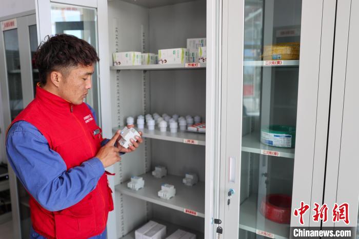 10月17日,在青海省海北藏族自治州剛察縣果洛藏貢麻村,久邁多杰檢查庫房內(nèi)的備品備件。中新社記者 薛蒂 攝