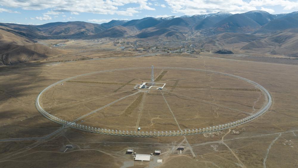 若從天空中鳥(niǎo)瞰,海拔四千多米的“巨石陣”中藏著一個(gè)巨大的“圓盤(pán)”——高海拔宇宙線觀測(cè)站“拉索”(LHAASO)。宇宙線是來(lái)自宇宙空間的高能粒子,被科學(xué)家稱(chēng)為傳遞宇宙大事件的“信使”。