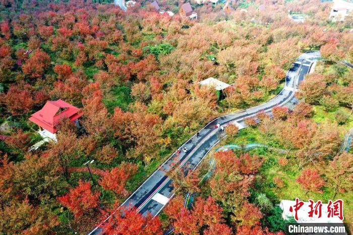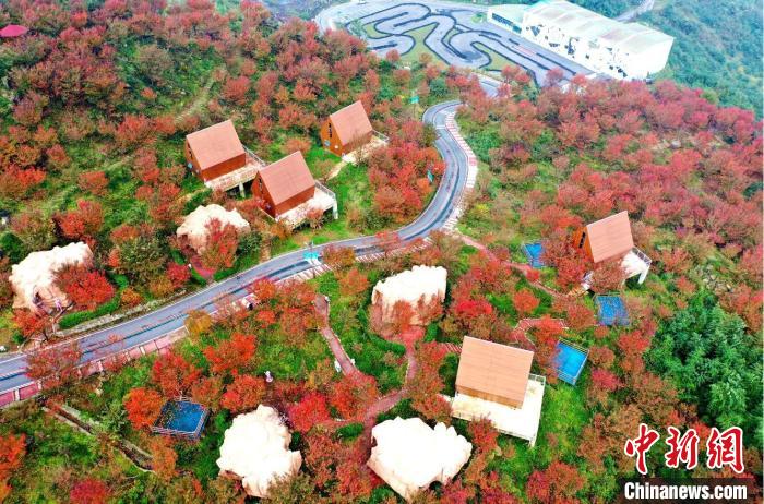 深秋時節(jié),位于四川阿壩州汶川縣漩口鎮(zhèn)趙公村的400余畝櫻花樹葉迎來最佳的觀賞期。放眼望去,五彩斑斕的櫻花樹葉紅遍山野,如同一幅秋日唯美畫卷。圖為滿山櫻花樹紅葉惹人醉。  伍排勇 攝