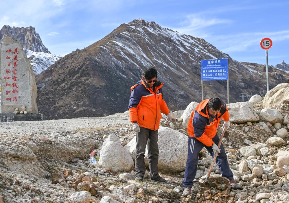 11月1日,黎平(右)和同事在國(guó)道317雀兒山段清理路邊的溝渠。新華社記者 王曦 攝