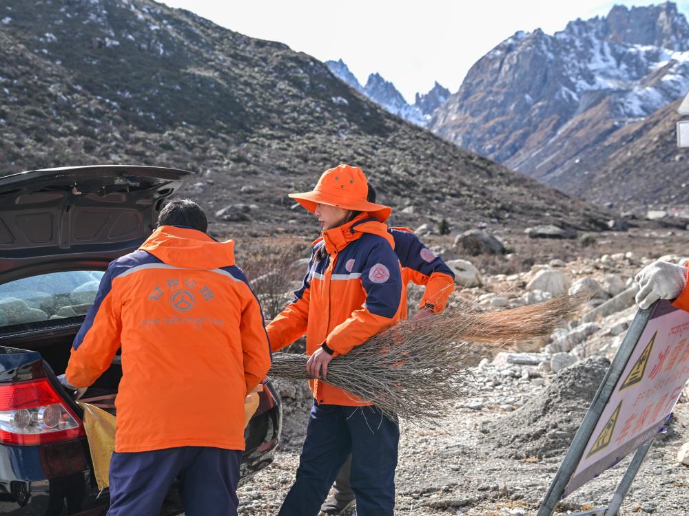 11月1日,呷瑪澤錯(cuò)(右)和同事正在整理道路養(yǎng)護(hù)工具。新華社記者 王曦 攝