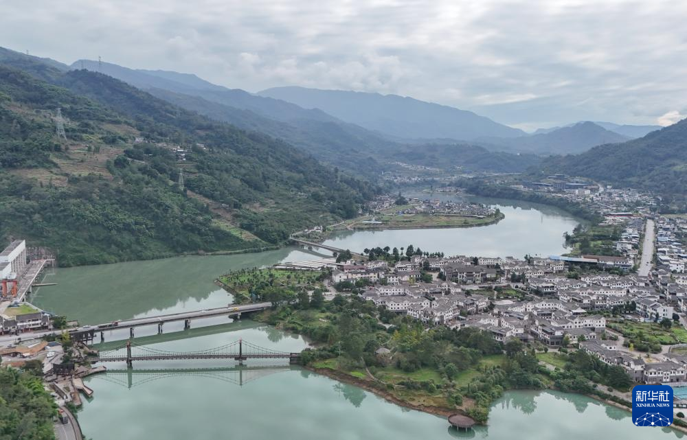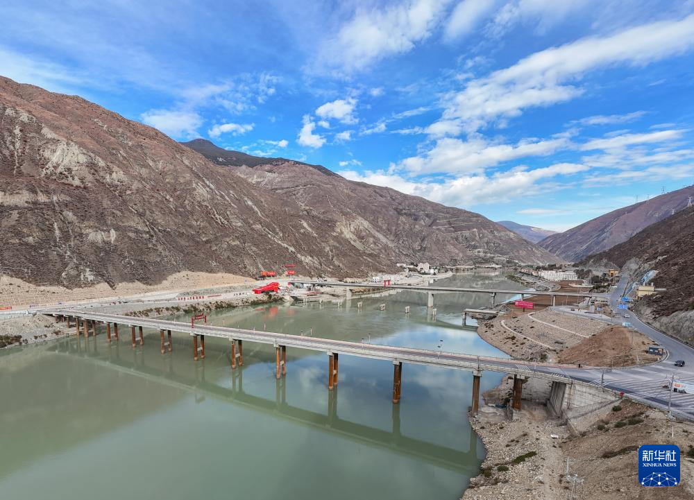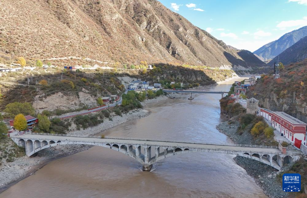 連接四川和西藏的國道317公路崗托大橋老橋,遠處是新修的崗托大橋(11月2日攝,無人機照片)。新華社記者 王曦 攝