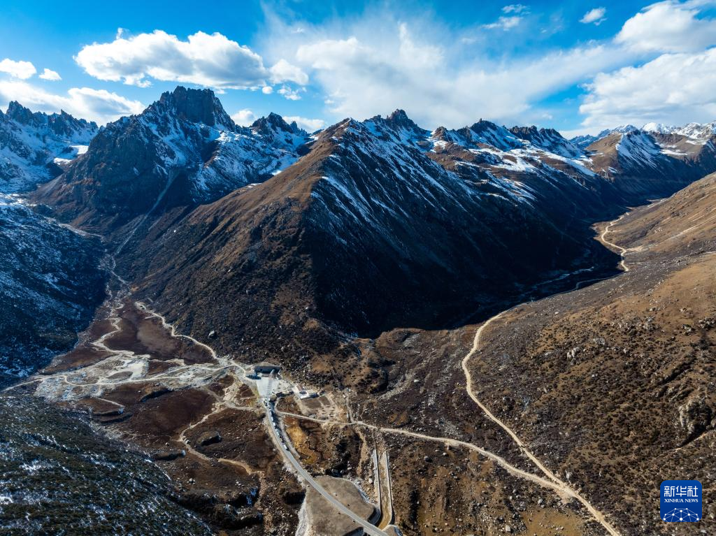 在四川省甘孜藏族自治州德格縣,左側(cè)是穿越雀兒山隧道的國道317公路,右側(cè)是過去翻越雀兒山埡口的國道317舊道(11月1日攝,無人機照片)。新華社記者 沈伯韓 攝