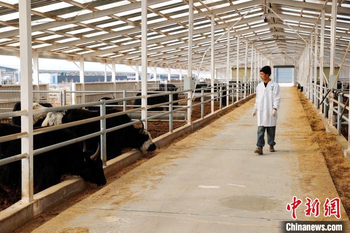 走進青海省海東市互助土族自治縣的海盛生態(tài)牧場,并排建設(shè)的牛棚內(nèi),千頭牦牛正在舔舐充滿酒糟味的飼草。