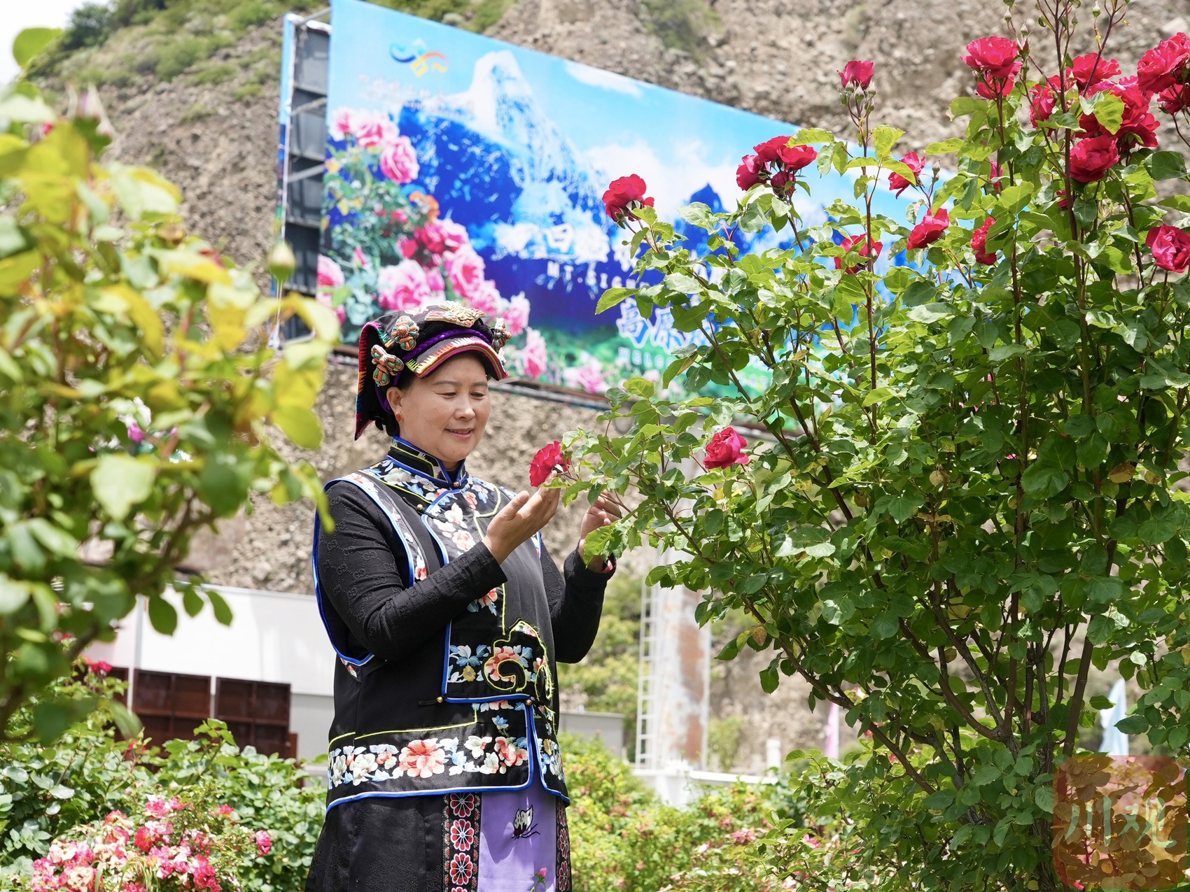小金縣達維鎮(zhèn)冒水村黨支部書記陳望慧在玫瑰生產(chǎn)基地內(nèi)欣賞玫瑰花。
