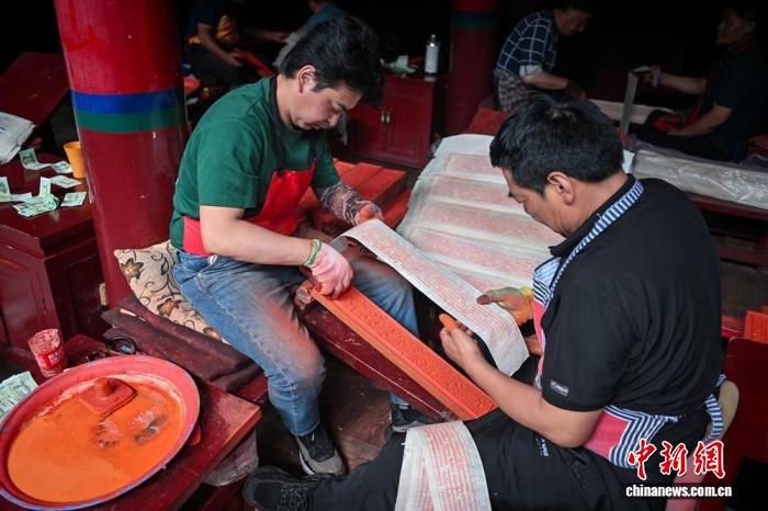 在藏版庫(kù)旁的印刷工坊里,10多名工匠正在忙碌。部分工匠手持墨刷,在《丹珠爾》印版上均勻涂墨,另一部分工匠不停翻轉(zhuǎn)印刷紙張或換新紙?!案瞎そ硞儗W(xué)了幾十年,從選料到印刷,每一步都不能急?!?2歲的西繞彭錯(cuò)已在印經(jīng)院工作41年,他指著桌上用瑞香狼毒草根皮制成的印紙介紹,這種紙要經(jīng)過(guò)泡、煮、捶打等11道工序,“紙的韌性好,放幾十年都不會(huì)壞,蟲(chóng)不蛀、鼠不咬,老祖宗傳下來(lái)的法子,錯(cuò)不了?!闭f(shuō)話(huà)間,西繞彭錯(cuò)已將印紙平整鋪在版上,用特制印版輕壓,片刻后揭下,一行行雋秀的藏文便清晰呈現(xiàn)。正是這群工匠對(duì)傳統(tǒng)技藝的堅(jiān)守,讓雕版技藝成為活態(tài)的文化遺產(chǎn)。
