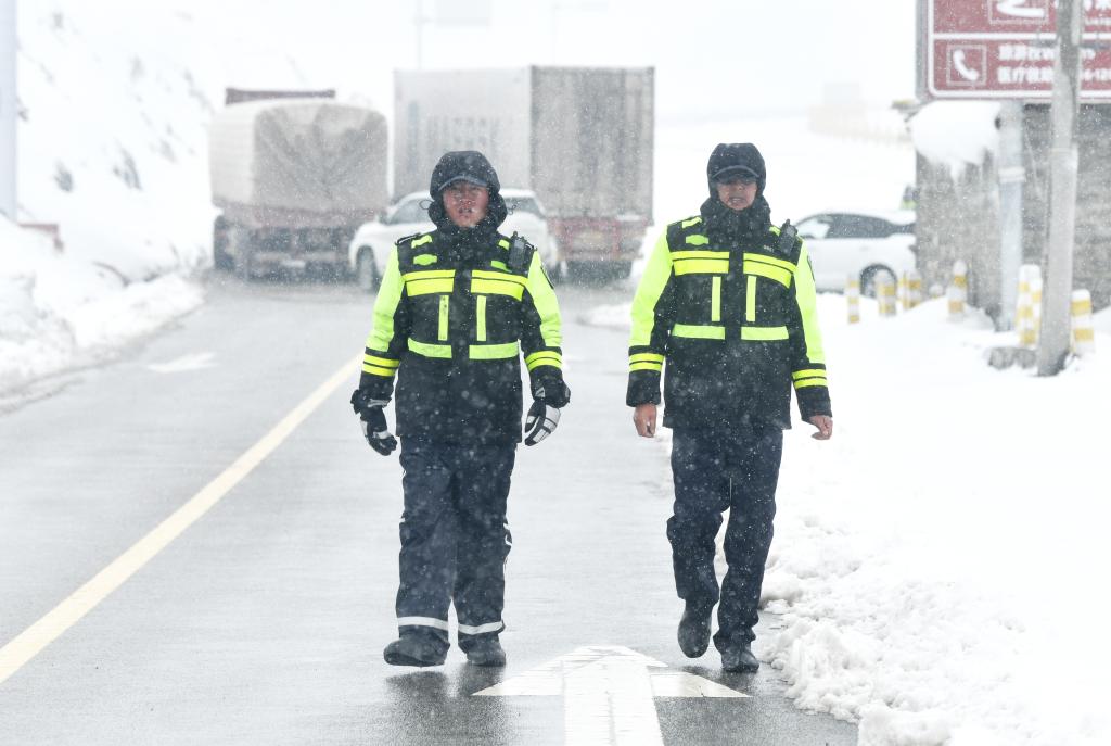 包永鵬(左)與王洛讓(右)在堵點(diǎn)執(zhí)勤。(甘孜公安供圖)