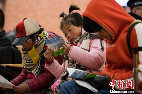 在候車室內(nèi),小姑娘正閱讀拉薩火車站發(fā)放的安全防護知識。 何蓬磊 攝
