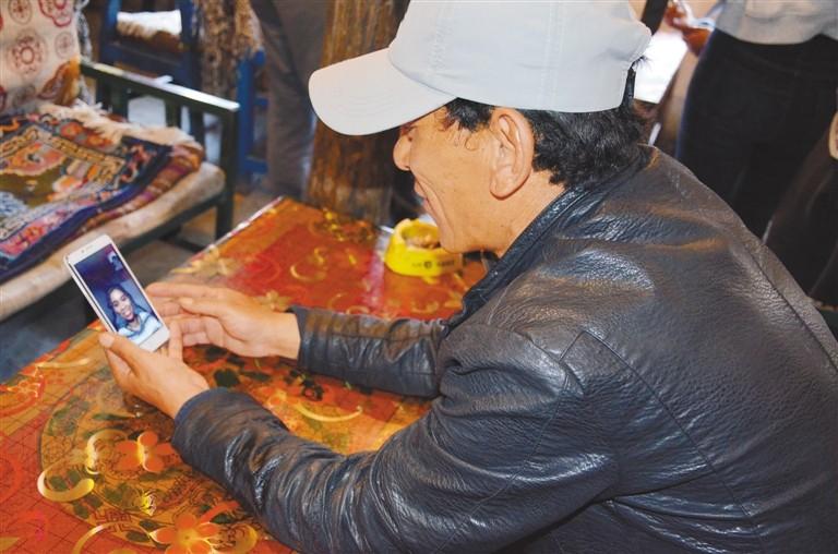 圖為山南市乃東區(qū)扎西妥門社區(qū)群眾洛桑正在社區(qū)茶館里通過手機(jī)無線網(wǎng)絡(luò)與在江蘇上學(xué)的女兒視頻通話。記者 劉楓 攝