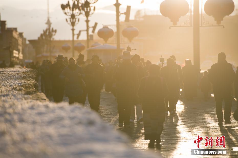 3月10日凌晨時(shí)分,雪域“圣城”拉薩的天空飄起片片雪花,迎來了今年的又一場(chǎng)降雪。3月的春雪為拉薩披上一層“薄紗”,銀裝素裹景色迷人。圖為雪后,拉薩民眾迎著朝陽出行。 文/曾嘉 圖/何蓬磊