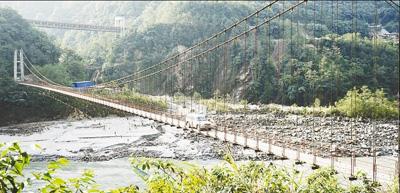 1994年,險(xiǎn)峻的雅魯藏布江峽谷建起了魯古吊橋,德興鄉(xiāng)與墨脫縣城從此可通車。圖為4月4日,一輛汽車小心翼翼地從魯古吊橋上通過。鄧建勝攝
