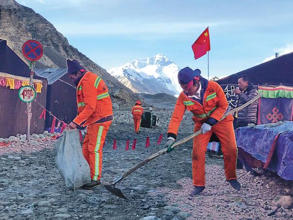 珠穆朗瑪峰巍然聳立在世界屋脊,是我國(guó)乃至全世界生態(tài)環(huán)境的“晴雨表”。近年來(lái),黨中央、國(guó)務(wù)院高度重視西藏生態(tài)環(huán)境保護(hù),在國(guó)家有關(guān)部委大力支持下和自治區(qū)相關(guān)部門(mén)共同努力下,珠峰地區(qū)一直實(shí)施嚴(yán)格的環(huán)保措施,形成了多元參與的珠峰生態(tài)環(huán)境保護(hù)格局。在嚴(yán)格的生態(tài)環(huán)保政策作用下,珠穆朗瑪峰我國(guó)西藏一側(cè)的生態(tài)環(huán)境持續(xù)向好。圖為近日,海拔5200米的珠峰大本營(yíng)內(nèi),環(huán)衛(wèi)工人在清理垃圾。記者 陳林 攝