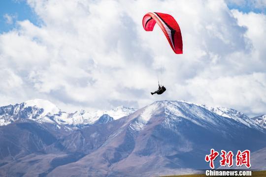 圖為滑翔傘運動員在羊八井高山訓(xùn)練基地附近進行滑翔表演。 何蓬磊 攝