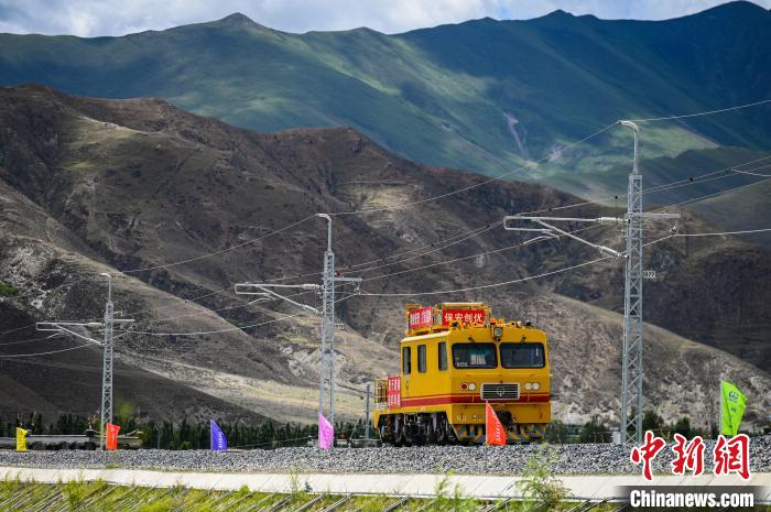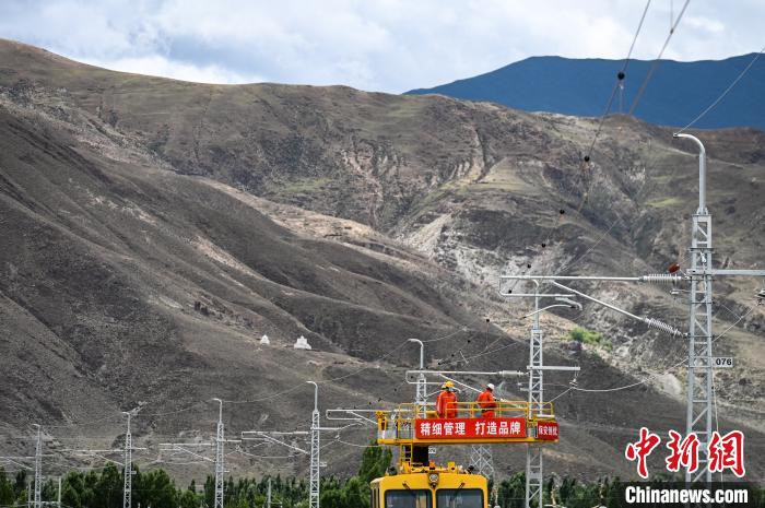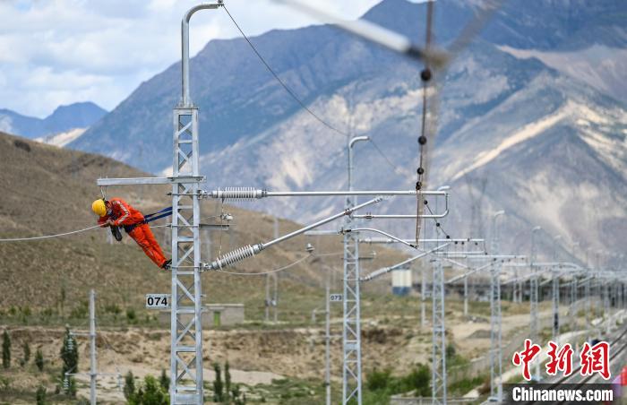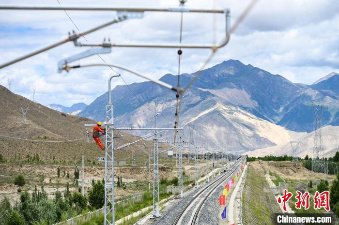 7月6日,拉林鐵路接觸網(wǎng)專業(yè)首件工程在西藏山南市扎囊至扎其區(qū)間成功建成。何蓬磊 攝