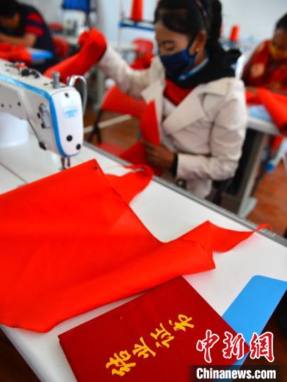 西藏山南森布日極高海拔地區(qū)生態(tài)搬遷安置點的牧民正縫制紅領巾。江飛波 攝