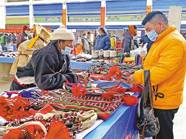 各大展臺(tái)上,牛羊肉、奶渣、酥油等農(nóng)畜產(chǎn)品,蟲(chóng)草、貝母、人參果等中藥材,各具特色的民族手工藝品等,引得人們流連忘返?!拔覀兊难┑匮ナ羌兪止ぶ谱鞯?,皮毛一體,這里面是羊毛,很暖和,高筒的180元一雙,低筒的150元一雙,擺攤不到一小時(shí),我們已賣(mài)出了8雙。”來(lái)自雙湖縣嘎措鄉(xiāng)合作社的羅培笑逐顏開(kāi)。據(jù)羅培介紹,這是他們合作社第6次參加該展銷(xiāo)會(huì),除了賣(mài)手工藝品,他們還賣(mài)牛羊肉?!爸挥?jì)算手工藝品,我們每次銷(xiāo)售額都在3萬(wàn)元左右?!?/p>