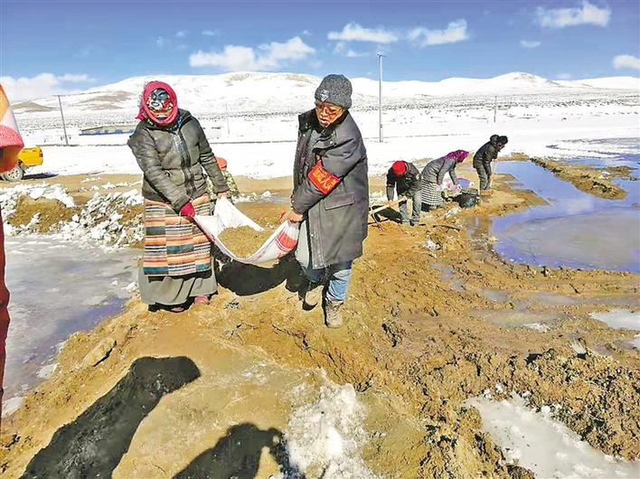 駐村期間,羅布頓珠(左二)同村民一起對(duì)嚴(yán)重影響農(nóng)牧民生產(chǎn)生活的滲水口進(jìn)行了堵截。 中國電信西藏公司供圖