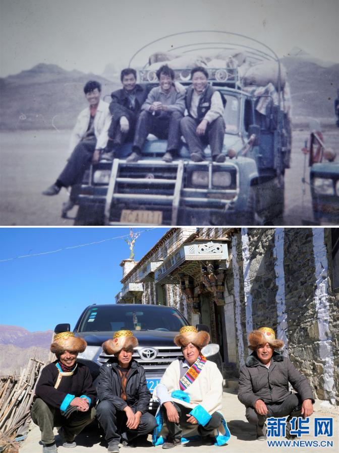 拼版照片:上圖:1994年,24歲的強(qiáng)巴(右二)和他的三個(gè)兄弟在西藏阿里地區(qū)跑運(yùn)輸時(shí),在自己購(gòu)買的“東風(fēng)”牌運(yùn)輸車前合影(強(qiáng)巴提供)。(新華社發(fā))