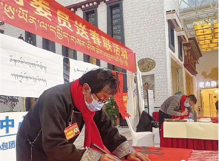 “這次我和各位書法家集聚于此,為委員們題寫春聯(lián)和書法作品,深感榮幸,這不僅進(jìn)一步弘揚(yáng)了傳統(tǒng)文化,更為大家送上了新春祝福,表達(dá)了美好的新年愿景,也希望我們書寫的作品通過各位委員傳遞到廣大群眾中,弘揚(yáng)主旋律、傳遞正能量,切實(shí)發(fā)揮文藝激勵人心的作用?!敝袊鴷覅f(xié)會會員、中國美術(shù)家協(xié)會會員、自治區(qū)書法家協(xié)會副主席、拉薩市書法家協(xié)會主席高延鴻說。