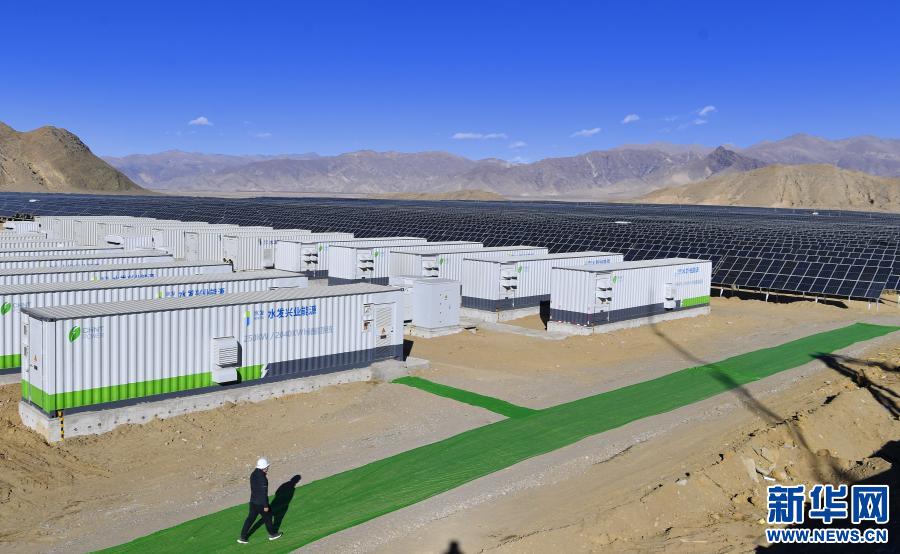 西藏日喀則市江當現(xiàn)代生態(tài)產(chǎn)業(yè)示范園內(nèi)的50兆瓦光儲電站儲能系統(tǒng)和太陽能光伏組件(2020年12月24日攝)。新華社記者 張汝鋒 攝