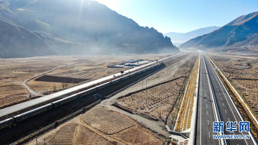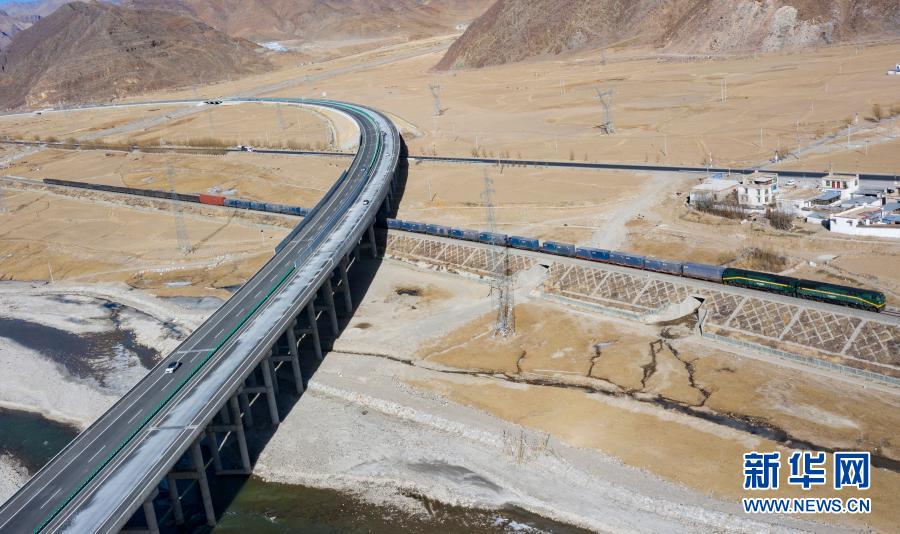 這是拉薩至那曲高等級(jí)公路和青藏鐵路沿線風(fēng)光(1月28日攝,無(wú)人機(jī)照片)。新華社記者 普布扎西 攝