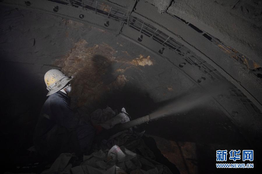 在派墨公路老虎嘴隧道出口端,工作人員正在進行掛網噴混凝土作業(yè)(2月10日攝)。新華社記者 孫非 攝