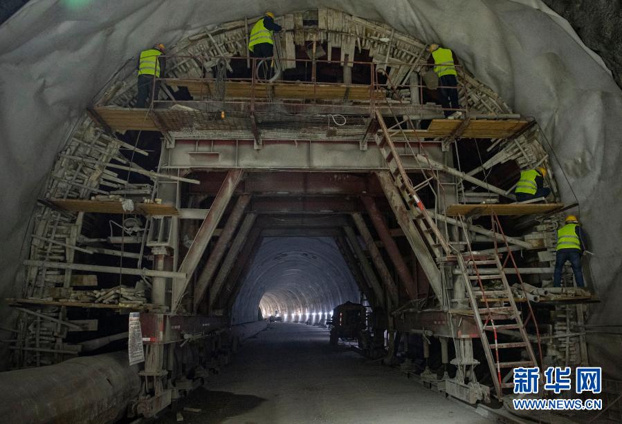 2月10日,在派墨公路老虎嘴隧道出口端,工作人員在進行二次襯砌施工。新華社記者 孫非 攝