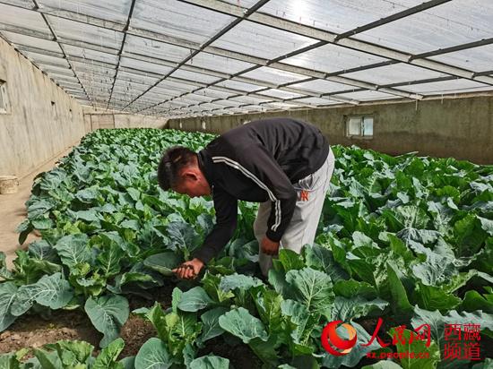 扎西旺杰在蔬菜大棚查看花菜長勢。李海霞 攝