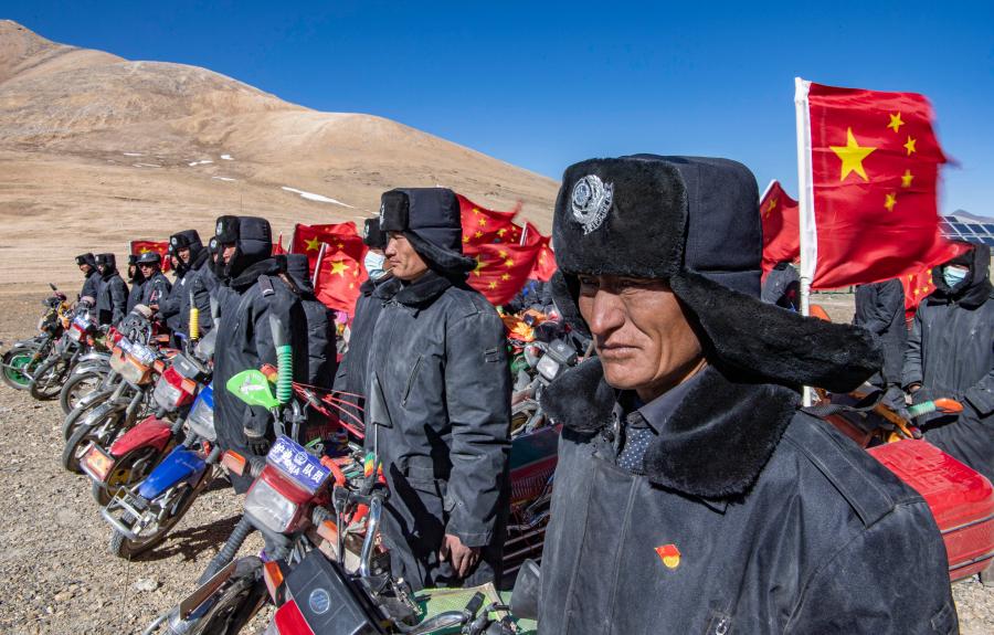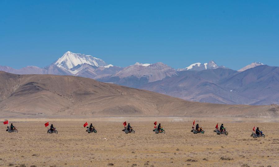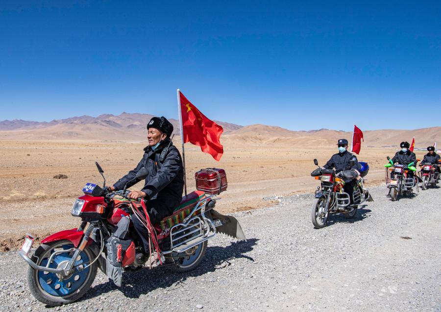西藏日喀則市薩嘎縣昌果鄉(xiāng)的一處村莊里,48歲的藏族漢子石覺塔布在風(fēng)中跨上一輛摩托車,向平坦無(wú)垠的高原邊緣騎去。他的車尾插著一面五星紅旗,被風(fēng)吹得獵獵作響,即便駛出很遠(yuǎn),那抹紅色在車輪卷起的煙塵中也依然醒目。