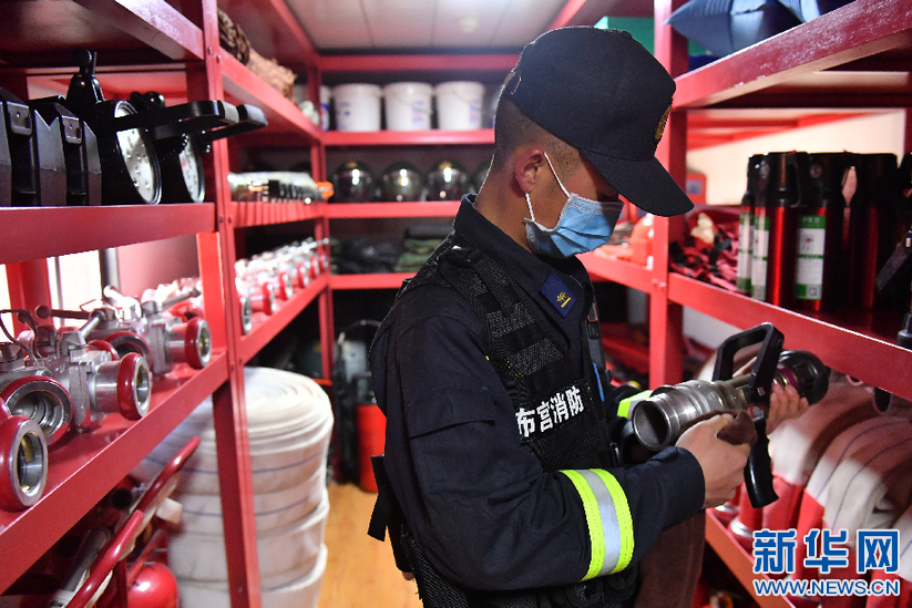 布達(dá)拉宮消防救援大隊(duì)隊(duì)員在巡邏期間檢查消防設(shè)施(3月4日攝)。新華社記者 孫瑞博 攝