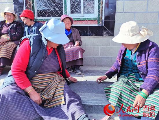 寬闊整潔的村道旁楊柳已吐出嫩芽,迎著陽光生機勃發(fā)。幾位老人坐在家門口曬著太陽玩“阿布朵”(擲石子),笑容始終掛在臉上。