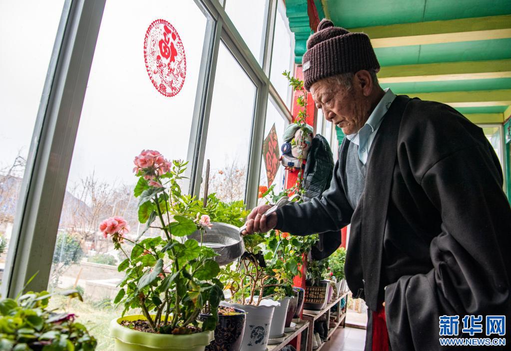 昂旺尼瑪在家中給花草澆水(2月18日攝)。新華社記者 孫非 攝