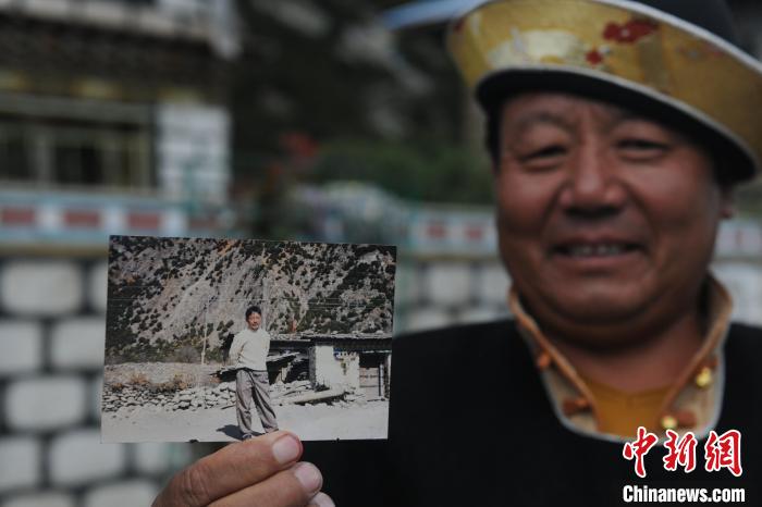 圖為林芝市工布江達縣巴河鎮(zhèn)雪卡村村民拿出舊照對比安居工程項目實施后的住房變化。農行西藏分行供圖 農行西藏分行供圖