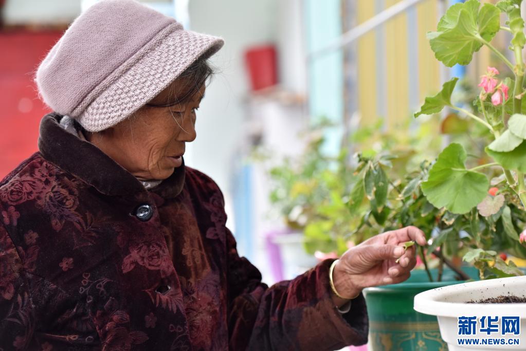 德慶卓瑪在山南市乃東區(qū)克松社區(qū)的家里照看花草(3月15日攝)。新華社記者 孫瑞博 攝