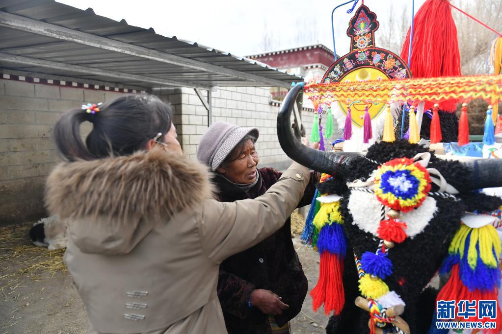 德慶卓瑪(右)和鄰居一起裝飾第二天要參加春耕儀式的拖拉機(jī)(3月15日攝)。新華社記者 孫瑞博 攝