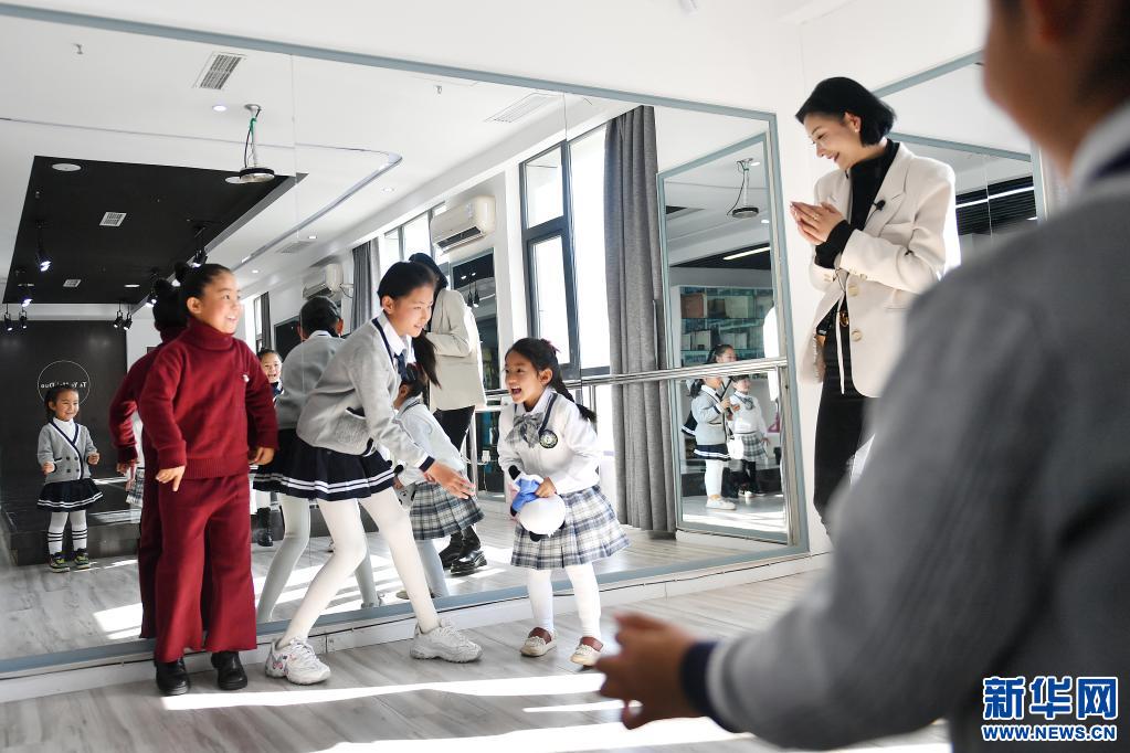 洛桑卓瑪(右后)和參加少兒模特培訓(xùn)的學(xué)生們一起做游戲(3月13日攝)。新華社記者 孫瑞博 攝