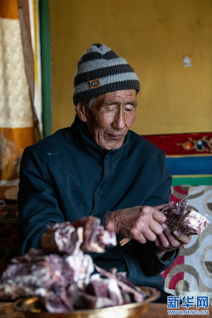 次仁老人在拉薩市當雄縣寧中鄉(xiāng)麥靈村的家里吃風干牦牛肉(4月16日攝)。新華社記者 孫瑞博 攝