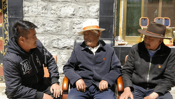 頓珠旺杰(中)、普布(右)、達(dá)瓦桑布(左)祖孫三人在促膝長(zhǎng)談(4月5日攝)。新華社記者 孫陽 攝