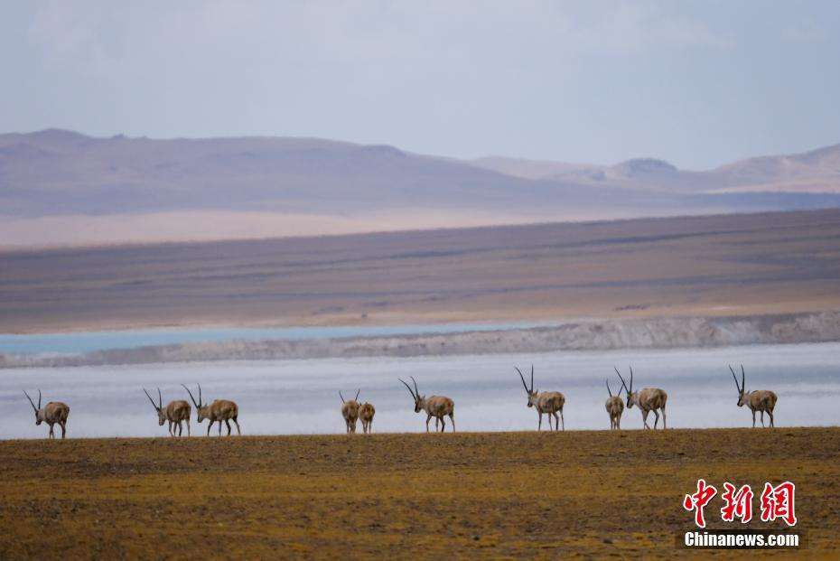 5月2日,西藏羌塘草原色林錯湖邊的藏羚羊。