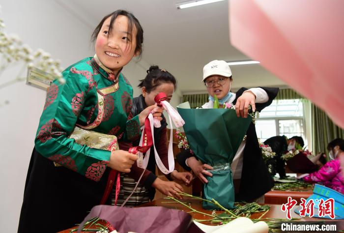 圖為兒童福利院的孩子們跟自己的“媽媽”包裝制作鮮花花束。貢嘎來松 攝