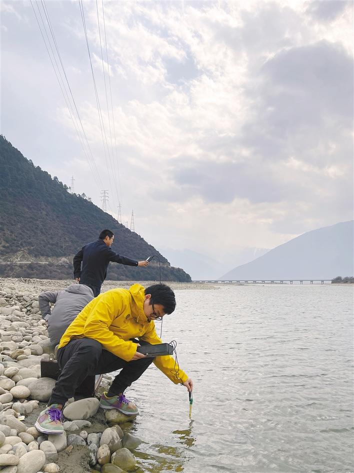 監(jiān)測(cè)組人員在川藏鐵路附近重要水體開(kāi)展現(xiàn)場(chǎng)監(jiān)測(cè)。