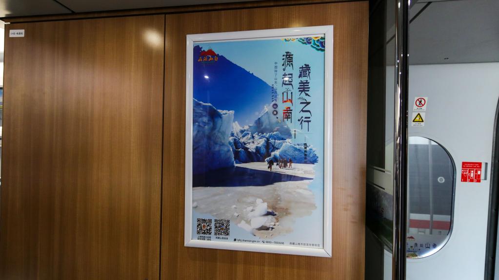從站臺(tái)開始,醒目的車身外彩貼盡入乘客眼中,由此,山南文化旅游的元素就將伴隨乘客的整段旅程。全列車廂,雍布拉康、昌珠古寺、桑耶古鎮(zhèn)、羊卓雍措等旅游目的地與“藏美之行 源起山南”“世界之巔在西藏 西藏之源在山南”等旅游口號(hào)互相輝映,將山南歷史文化與盛景濃縮其中,呈現(xiàn)在旅客面前,讓大家近距離感受山南迷人的美景和悠遠(yuǎn)的歷史。
