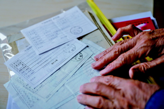 4月22日,李純民在天津家中展示向青藏鐵路建設捐款的部分匯款單存根。記者劉金海、黃臻攝