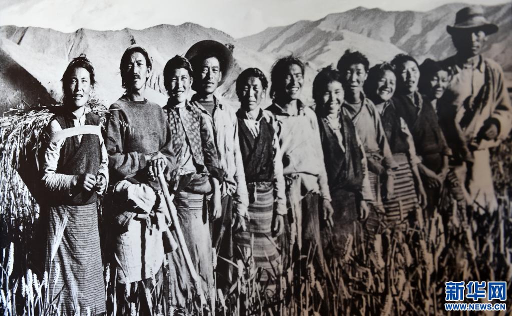 次仁拉姆(左一)當年和互助組成員在田間合影(資料照片)。新華社發(fā)