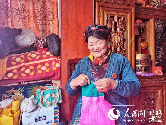 央金正在織毛衣,陽光灑在她的臉上。人民網(wǎng) 李海霞攝