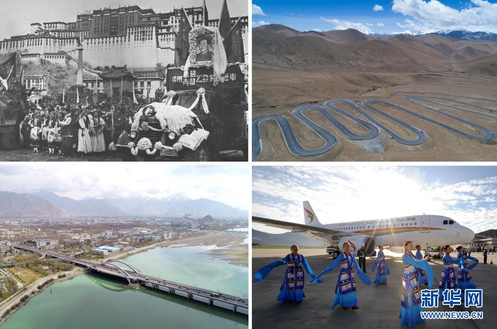 這是一張拼版照片:左上圖為1954年12月25日,康藏(今川藏)、青藏兩條公路通車(chē)儀式在布達(dá)拉宮前舉行(資料照片);左下圖為橫跨在拉薩河上的拉薩市區(qū)公路(2019年4月3日新華社記者晉美多吉攝,無(wú)人機(jī)照片);右上圖為通往珠峰的公路(2017年5月19日新華社記者 普布扎西攝);右下圖為西藏航空有限公司成立并舉行首航儀式(2011年7月26日新華社記者覺(jué)果攝)。新華社發(fā)