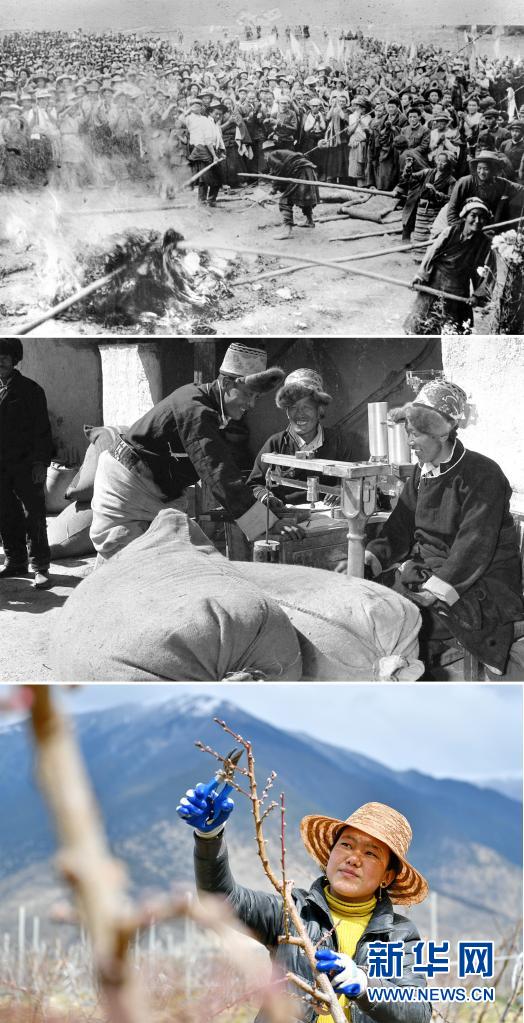 這是一張拼版照片:上圖為1959年8月,西藏墨竹工卡縣的翻身農(nóng)奴焚燒三大領(lǐng)主的剝削文契(新華社發(fā));中圖為1984年,江孜縣農(nóng)民洛桑旺堆(左)向國(guó)家出售余糧。他家承包土地100多畝,農(nóng)忙種地,農(nóng)閑搞建筑、跑運(yùn)輸(新華社記者土登攝);下圖為2020年3月22日,西藏林芝現(xiàn)代蘋(píng)果標(biāo)準(zhǔn)化示范園的工作人員為桃樹(shù)剪枝。該示范園實(shí)施農(nóng)機(jī)農(nóng)藝結(jié)合、水肥一體化及“果草畜循環(huán)”,大面積推廣蘋(píng)果矮砧集約高效栽培技術(shù),帶動(dòng)米林縣羌納鄉(xiāng)林巴、才巴、色沃村及附近的農(nóng)戶增收(新華社記者 張汝鋒 攝)。新華社發(fā)