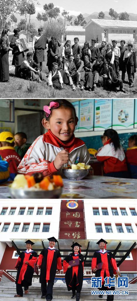 這是一張拼版照片:上圖為拉薩中學(xué)的應(yīng)屆畢業(yè)生在校園里練歌,準(zhǔn)備參加畢業(yè)典禮(新華社記者任用昭攝);中圖為一名藏族女孩在西藏雙湖縣嘎措鄉(xiāng)小學(xué)內(nèi)享受“三包”(包吃、包住、包學(xué)習(xí)費(fèi)用)政策(2014年6月29日新華社記者普布扎西攝);下圖為2017年11月10日,西藏大學(xué)舉行首屆博士研究生畢業(yè)典禮,向4名畢業(yè)生授予博士學(xué)位。這4名博士分別來(lái)自藏族歷史專業(yè)、藏語(yǔ)言文學(xué)專業(yè)及高原醫(yī)學(xué)專業(yè)(新華社記者覺(jué)果攝)。新華社發(fā)