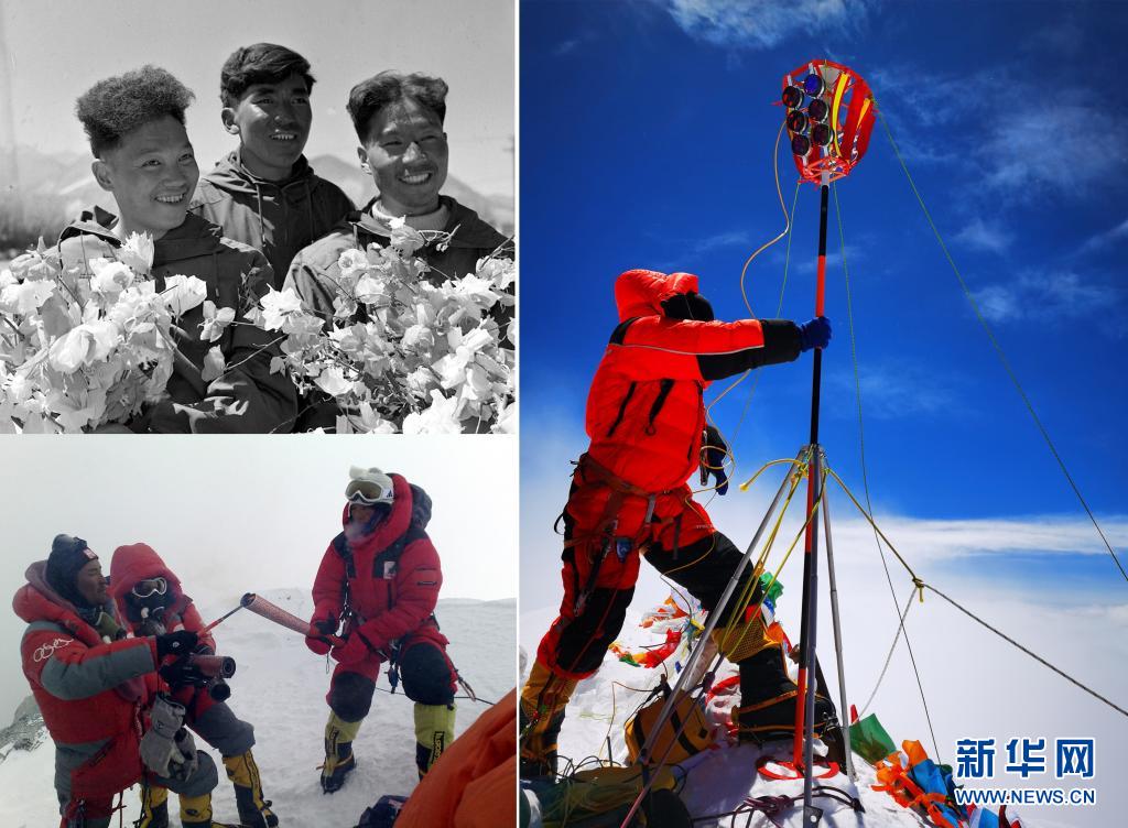 這是一張拼版照片:左上圖為1960年5月登上珠穆朗瑪峰頂?shù)闹袊?guó)登山隊(duì)隊(duì)員王富洲(右)、貢布(中)和屈銀華(資料照片 新華社發(fā));左下圖為2008年5月8日,北京奧運(yùn)圣火珠峰傳遞登山隊(duì)隊(duì)員羅布占堆(左)點(diǎn)燃第一棒火炬手吉吉手中的“祥云”火炬(新華社發(fā));右圖為2020珠峰高程測(cè)量登山隊(duì)隊(duì)員在珠穆朗瑪峰峰頂開(kāi)展測(cè)量工作(2020年5月27日新華社特約記者扎西次仁攝)。新華社發(fā)