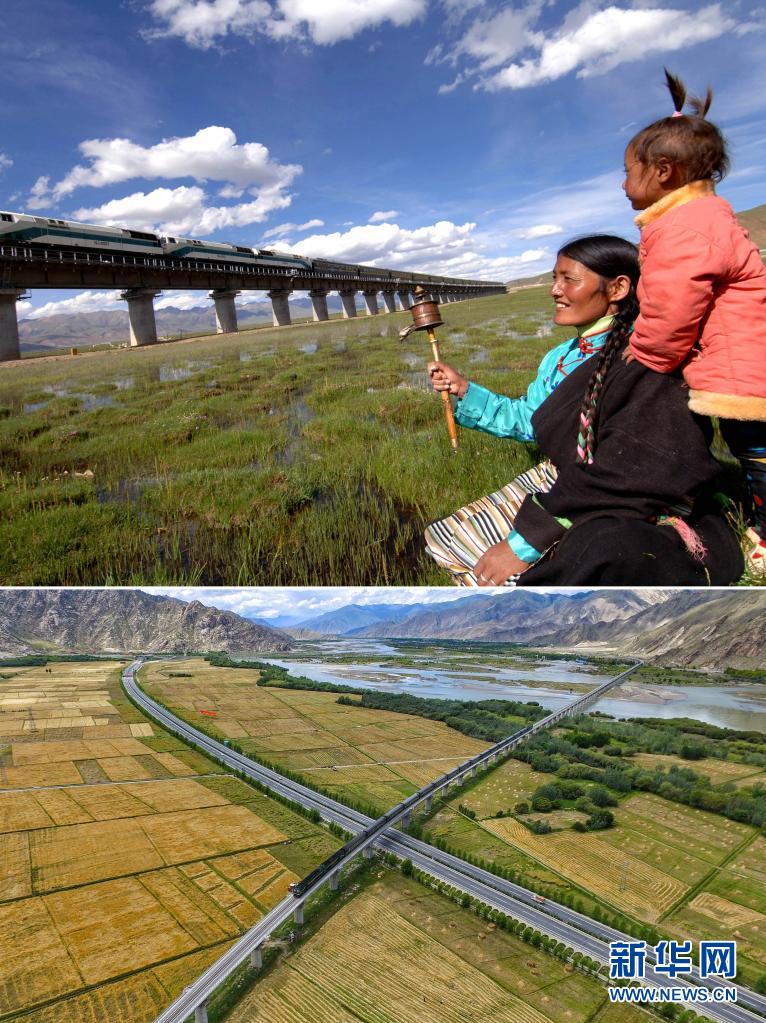 這是一張拼版照片:上圖為西藏當(dāng)雄縣藏族群眾在觀看火車(chē)駛過(guò)(2006年6月17日 新華社記者覺(jué)果攝);下圖為在西藏拉薩市曲水縣拍攝的公路與鐵路(2016年8月17日新華社記者普布扎西攝 無(wú)人機(jī)照片),西藏已形成了公路、鐵路、航空的立體交通網(wǎng)絡(luò)。新華社發(fā)